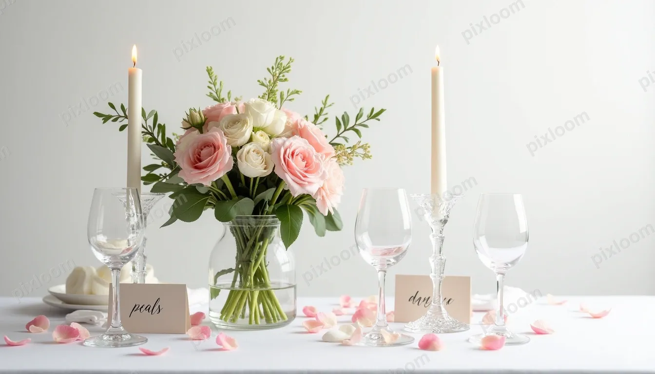 Product / Commercial1344x768Wedding reception table setting, flowers, candles, elegant place cards, crystal glassware