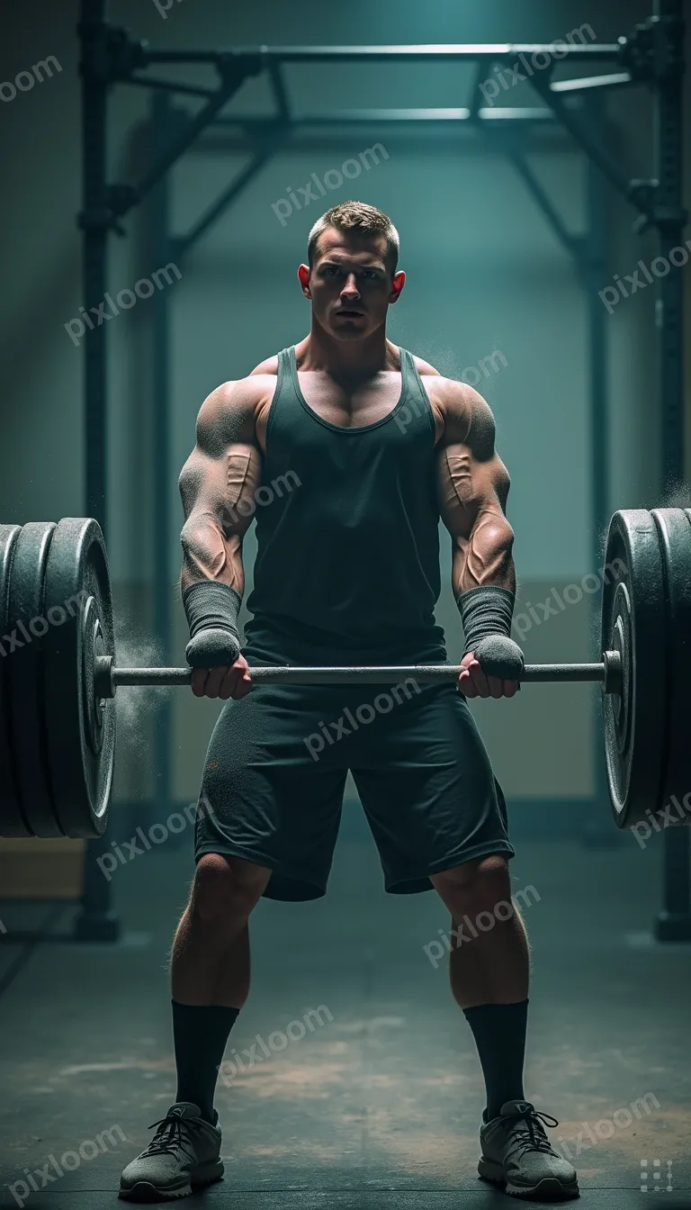 Cinematic Dramaadults768x1344Weightlifter mid-rep at a crossfit gym, chalked hands, barbell, intense focus, gritty lighting