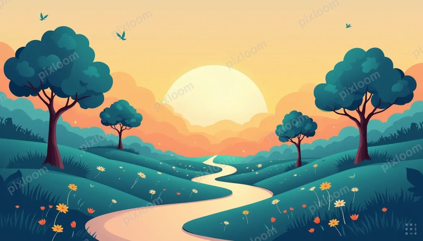 Vector1344x768Winding path through a garden at dawn in a flat vector illustration. Commercial vector art with flat design. Layered foreground, midground, and background. Centered focal structure; balanced symmetrical layout; centered composition; balanced layout. Clean geometric shapes; crisp hard edges; subtle linear gradients. Soft long cast shadows; glossy highlight accents. Minimal stroke outlines. Solid color blocks; rounded corners. High-chroma saturated palette with teal–orange accents; blue, teal, warm orange. Minimal paper texture; modern commercial look; clean glossy finish; high contrast.