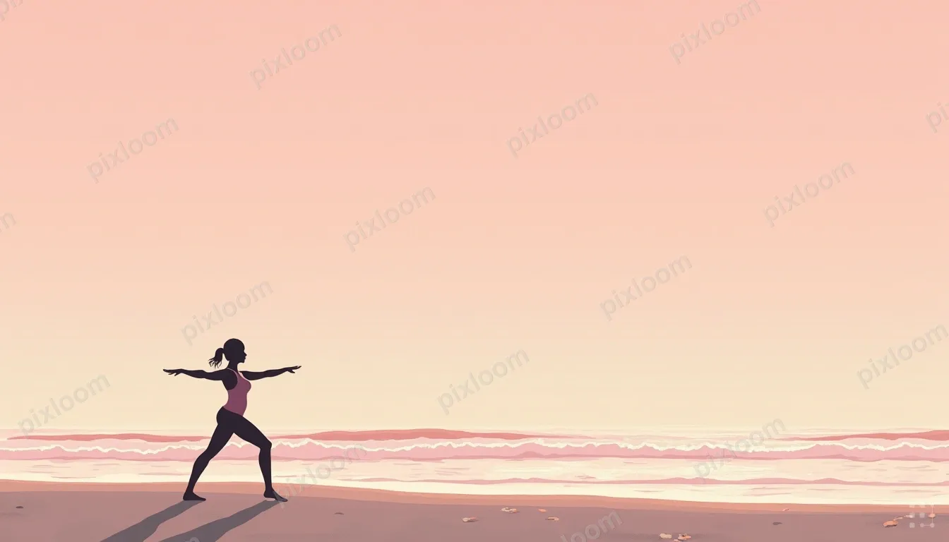 Minimalistadults1344x768Woman doing sunrise yoga on a beach, warrior pose silhouette, ocean waves, pink sky