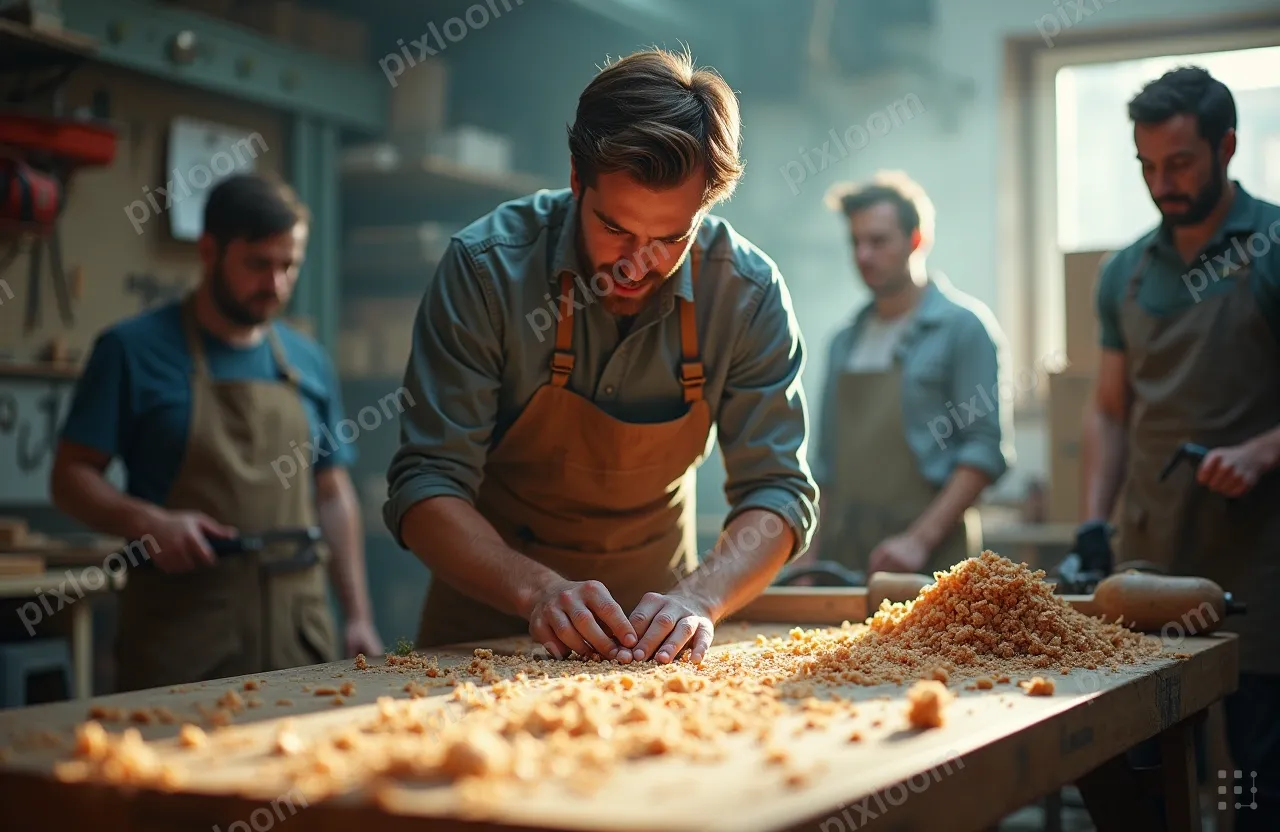 Cinematic Dramaadults1280x832Workshop instructor demonstrating woodworking to adult students, shavings, tools, maker space