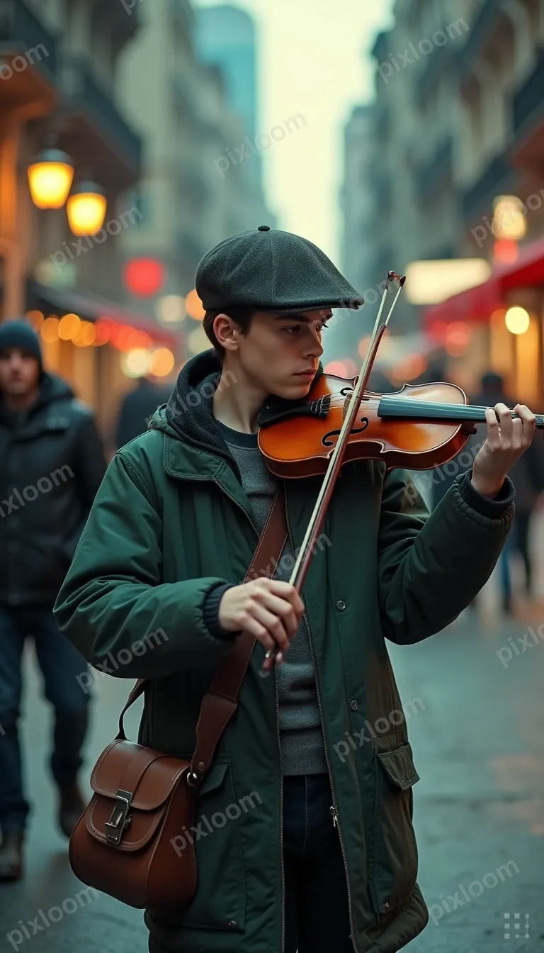 Cinematicbigkids768x1344Young person busking with a violin on a city street, passersby stopping, hat with coins